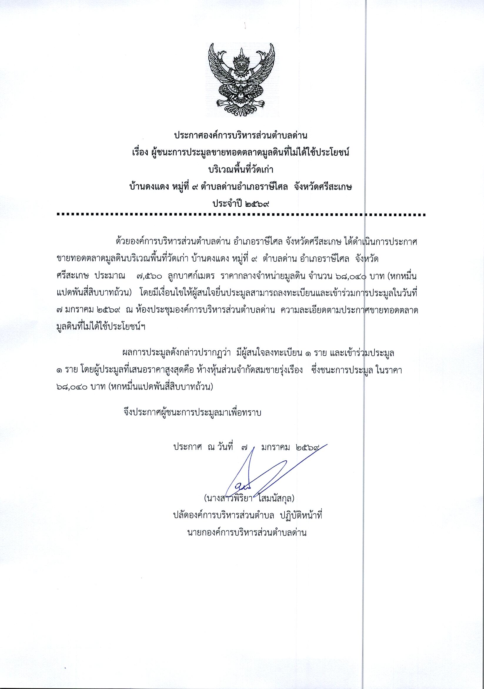 ประกาศองค์การบริหารส่วนตำบลด่าน เรื่อง ผู้ชนะการประมูลขายทอดตลาดมูลดินที่ไม่ได้ใช้ประโยชน์ บริเวณพื้นที่วัดเก่า บ้านดงแดงหมู่ที่ 9 ตำบลด่าน อำเภอราษีไศล จังหวัดศรีสะเกษ วันที่ 9 มกราคม พ.ศ. 2569 เวลา 11:35:41 น. ข่าวสารประชาสัมพันธ์, ประกาศจัดซื้อจัดจ้าง